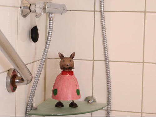 eine Duschvorlage, zwei Handtücher, ein Geschirrhandtuch und